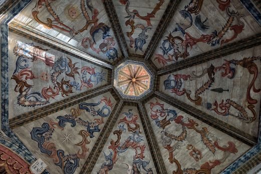 In der Decke des Kirchenschiffs sind neben dem Wappen der Dominikaner die marianischen Symbole wie der Turm, die Zeder, die Palme, der Spiegel, die Sonne und der Mond dargestellt.