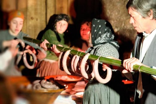 The moira is a sausage made up of bread, meats of vines, cooking syrup of pork and blood, seasoned with salt, paprika, pepper, wine and garlic. Filled in thin pork and smoked gut. It has dark brown or black color and pasty consistency. It has a horseshoe shape and weighs about 150g.