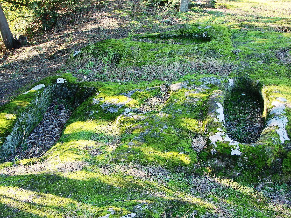 Medieval Epoch Set of three graves carved out of the rock, located along a path. One of the graves is partially cut and another one is cut only near the "feet".