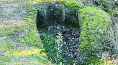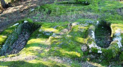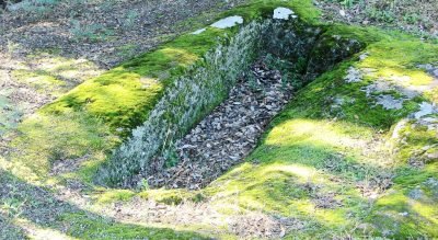 Set of three graves excavated in the rock, located next to a path. One of the graves is partially cut and another one is cut only near the "feet".