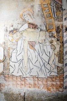 En la pared de fondo la pintura se divide en varios paneles, separados por marcos. En el lado del Evangelio es visible Santa Catalina de Alejandría identificada por la presencia de sus atributos (rueda dentada y espada en la mano izquierda colocada sobre la cabeza del tirano dispuesta a sus pies). Se sigue la representación de la Lamentación sobre Cristo Muerto y luego San Santiago presentado como romero con el bastón de peregrino de punta bicuda en la mano derecha y con un libro en la mano izquierda. En el lado de la Epístola es visible Santa Bárbara con un libro en la mano izquierda y la torre de color gris a la derecha.