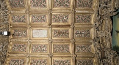 Paneles en talla dorada y policromada con cuadros de la pasión de cristo revisten las paredes laterales de la capilla mayor. En el techo son también visibles cajones de madera policromada y enmarcados en la talla dorada.