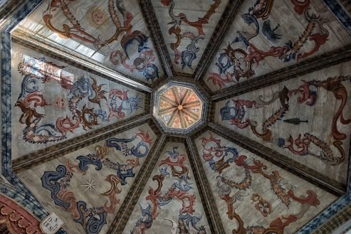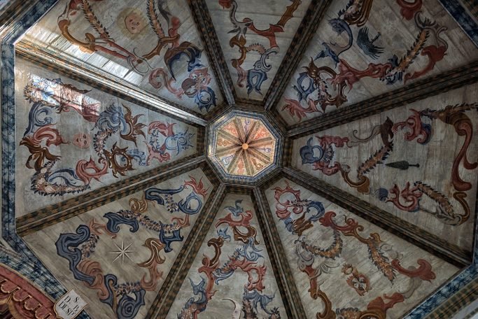Dans le plafond de la nef sont représentés les symboles mariaux, tels que la tour, le cèdre, la palme, le miroir, le soleil et la lune, en plus des armoiries des dominicains.