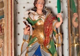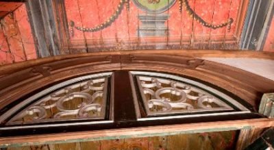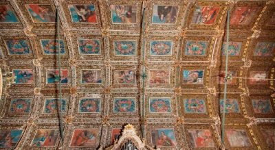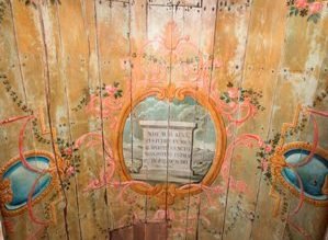 La doublure de plafond qui affiche la date de 1750 est décorée dans des cercueils à double ossature présentant des fleurs à des angles qui entourent les panneaux centraux peints de scènes de la Vierge, flanqués de panneaux marianes et de panneaux hagiographiques avec les saints.