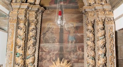 Après avoir enlevé le retable baroque, qui se trouve actuellement dans la chapelle de la maison de Guimarães, nous avons le retable des saintes mères en sculpture de joanine dorée avec une vente aux enchères exubérante de boiseries polychromes et le retable de style national de la chapelle Notre-Dame. de Fatima.