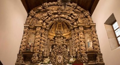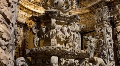 Le retable principal est mis en évidence dans la sculpture dorée, avec les fleurs et les sirènes dans la voûte ci-dessus. Le trône orné de plusieurs structures de pélican est inséré dans une tribune couverte de demi-dôme extrêmement décorée.