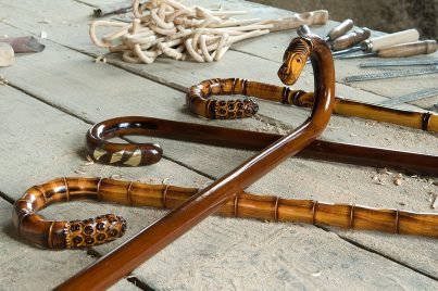 Le strisce di legno, che daranno origine ai futuri bastoncini da passeggio, vengono cotte usando vecchi vasi di ferro a tre gambe, in cima al fuoco, sempre accessibili, da un camino. L'estremità della striscia di legno (che sarà versata) viene immersa nell'acqua bollente per diventare più malleabile, riducendo così il rischio di rottura della punta della canna.