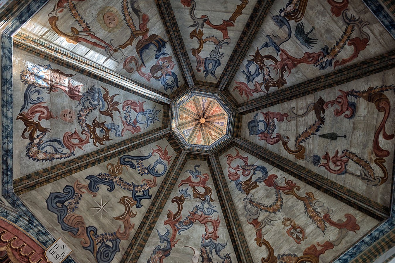 Nel soffitto della navata sono rappresentati i simboli mariani, come la torre, il cedro, la palma, lo specchio, il sole e la luna, oltre allo stemma dei Domenicani.