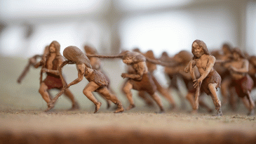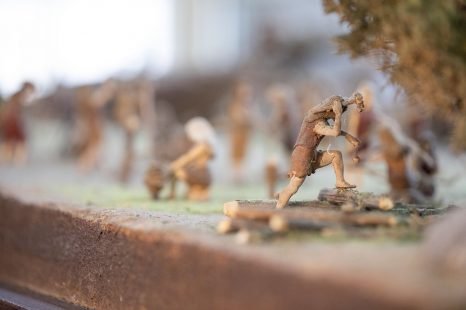 The scale model with 120 human figures shows the different construction phases of a dolmen and its tumulus (a mound made of soil and stones). Visitors learn about the different burial monuments and the evolution of this ritual from the Neolithic period until the end of the Bronze Age.